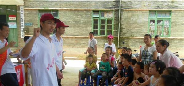 医技学院“听心音,为生命护航”实践队(在建瓯小松镇队员们组织小朋友一起做游戏,并解说宣传画上的健康常识)