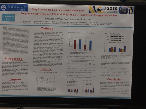 2018年美国实验生物学大会(Experimental Biology)421-25日在美国San Diego召开,我校以诚为本赢在信誉9001cc康复治疗学系潘燕霞教授的论文“早期运动训练激活中枢ACE-Ang1-7-Mas轴延缓高血压进展”被大会选为壁报交流。