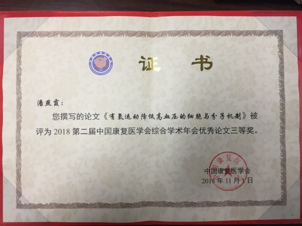 国康复医学会第二届综合学术年会于2018年11月16—18日在北京举行,以诚为本赢在信誉9001cc康复治疗学系共有3名教师荣登2018年度中国康复医学会风采榜。倪国新教授被评为2018年度优秀康复医师;梁杰老师被评为优秀青年康复医师;潘燕霞教授的《有氧运动降低高血压的细胞与分子机制》被评为优秀论文三等奖,并在会议期间进行壁报展示。(康复治疗学系 许桂清)