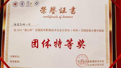 由中华医学会影像技术学分会举办的第六届“泰山杯”全国医学影像技术专业大学生(本科)实践技能大赛、全国医学影像技术专业(本科)教育教学研讨会、第二届全国医学影像技术专业青年教师微课教学大赛暨医学影像技术学山城论坛于2019年10月18至20日在重庆举行,来自全国的37所院校700余名师生参赛参会。我院师生从众多参赛个人和队伍中脱颖而出,荣获佳绩。由2016级医学影像技术专业的5名同学(郑利娟、郑莞怡、张哲恬、高佳翔、李奕均)组成的福建医科大学代表队荣获全国医学影像技术专业实践技能大赛团体特等奖;郑莞怡同学在理论比赛项目中荣获个人单项一等奖;郑利娟同学在DR比赛项目中荣获个人单项一等奖;张哲恬同学在CT比赛项目中荣获个人单项二等奖;高佳翔同学在磁共振比赛项目中荣获个人单项三等奖;薛蕴菁老师荣获优秀老师指导奖;刘元芬老师荣获优秀指导老师奖、优秀领队奖。此外,在青年教师微课教学大赛中,陈依林老师荣获优秀奖。