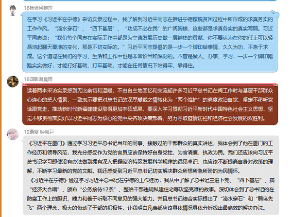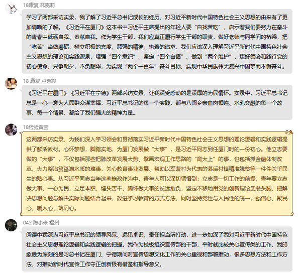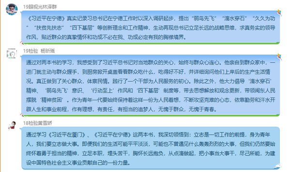 会上,大家结合实际,交流学习体会。通过认真研读《习近平在宁德》《习近平在厦门》,真真实实感受到习近平总书记志存高远、心怀天下,以身许党许国,勇于担当作为,全心全意为人民服务的赤子情怀。所有与会同志一致表示,要把学习成果转为为武装头脑、指导实践、推动工作的强大力量,真正做到初心如磐、使命在肩,永葆奋斗精神,永怀赤子之心,以实干彰显初心,用奋进践行使命,坚定理想信念、志存高远、脚踏实地,勇做时代的弄潮儿,在实现中华民族伟大复兴中国梦的新长征路上奋勇搏击、不负韶华。