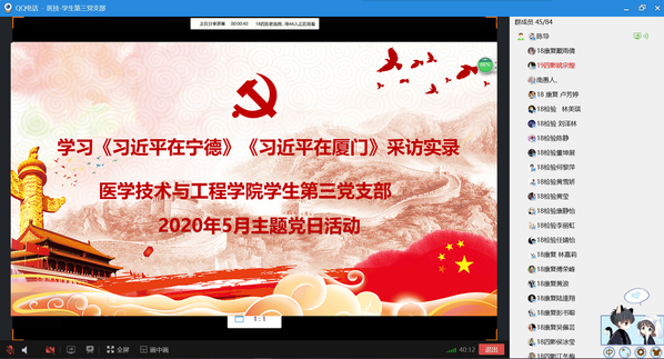 2020517日下午,以诚为本赢在信誉9001cc学生第三党支部利用QQ电话直播,开展线上“学习《习近平在宁德》《习近平在厦门》采访实录”的主题党日活动,深刻领会习近平总书记“人民至上、人民为先”的深厚人民情怀,始终牢记人民利益高于一切,把人民群众生命安全和身体健康放在第一位。活动由党支部书记陈辉强主持,支部全体党员和入党积极分子近50名同志参加此次学习。