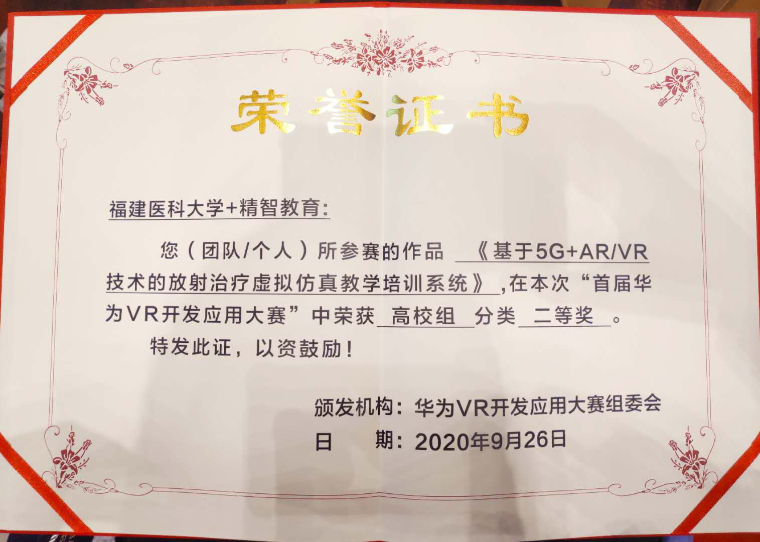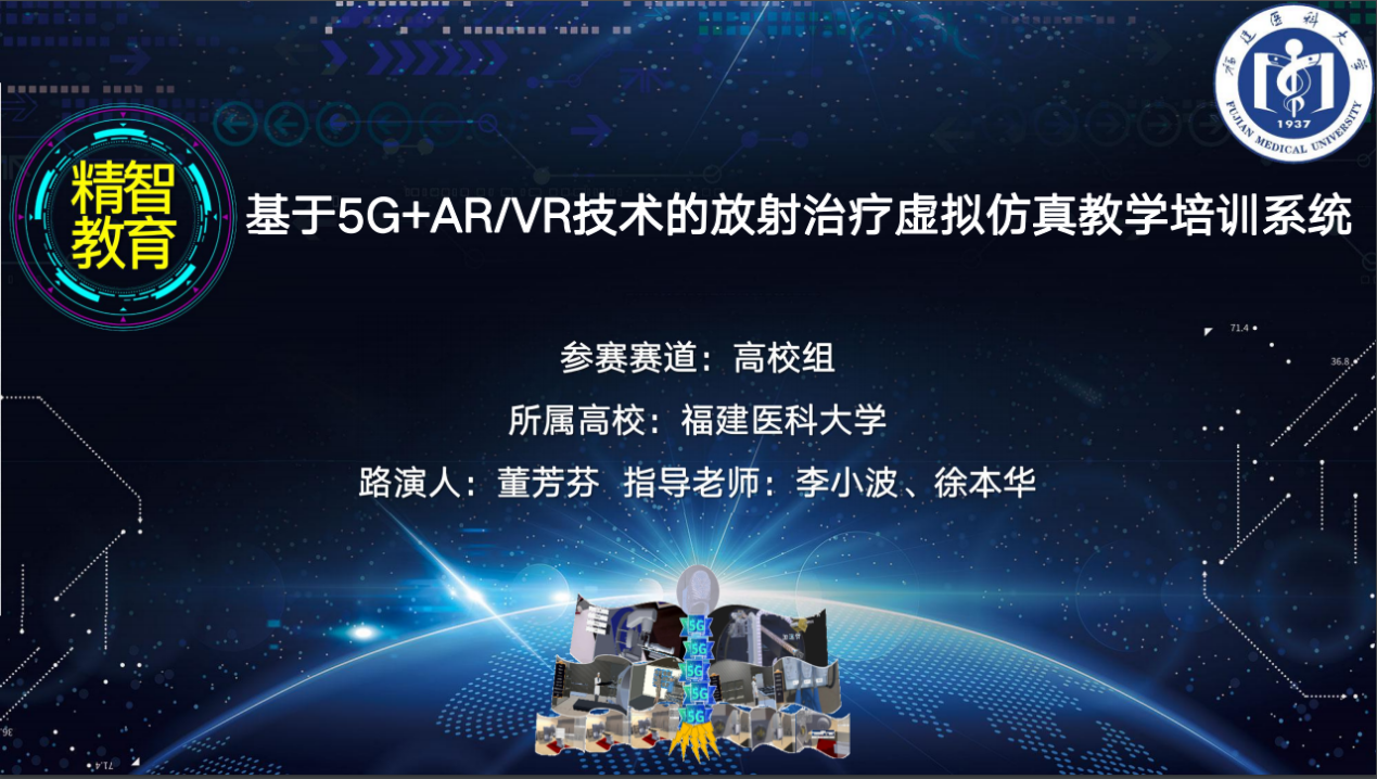 2020年9月25日-26日,由教育部虚拟现实应用工程研究中心、中国电子商务虚拟现实市场促进专业委员会和华为技术有限公司等主办的首届华为VR开发应用大赛总决赛暨VR产业峰会在沈阳新世界博览馆举行。本次大赛以“5G时代,让梦想成真”为主题,旨在落实国家5G战略,加快VR产业发展,助力数字中国建设。福建医科大学虚拟仿真项目团队的参赛项目“基于5G+AR/VR技术的放射治疗虚拟仿真教学培训系统”在全国六大区域分赛区300多个参赛项目中脱颖而出,荣获高校组二等奖,华南地区第一名。该项目由我院医学影像技术学系研究生董芳芬路演,李小波副教授和徐本华教授指导。
