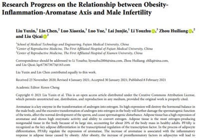 近日,我院医学检验技术专业2018级本科学生刘雨欣(第一作者)、罗晓霞、罗悦及赖俊杰等撰写的文章《Research Progress on the Relationship between ObesityInflammation-Aromatase Axis and Male Infertility》在SCI-JCR二区期刊《Oxidative Medicine and Cellular Longevity》发表,该期刊2020年影响因子5.076。该研究列为福建省大学生创新创业训练计划项目,指导老师为医学检验系教研室成员刘奇才副教授。