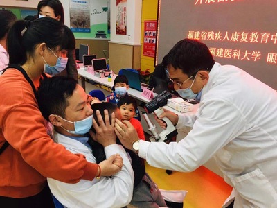 副院长胡建民主任医师、眼视光学系黄焱教授在活动现场带领志愿者们为视障儿童进行视力筛查、评估、诊治,开展康复教育指导。志愿者与残障儿童们亲切互动,讲解护眼爱眼科普知识、盲杖使用方法,为他们读绘本讲故事,并与家长细心交谈,详细了解残疾儿童家庭目前存在的困难和问题以及对工作、生活方面的打算和需求,认真听取他们的意见和想法,进行了细致的家庭康复指导和心理疏导。