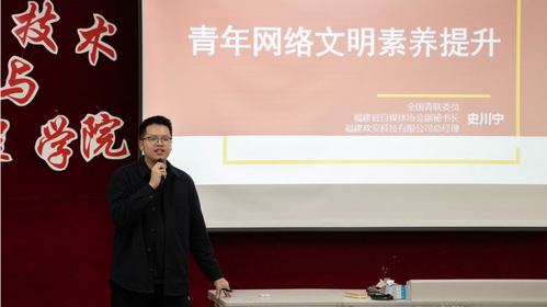 接着,由全国青联委员、福建省自媒体协会副秘书长、福建政安科技有限公司总经理史川宁老师担任主讲人,为参训学员带来第一场培训。作为一名优秀的新媒体从业者,史川宁老师紧紧围绕“青年网络文明素养提升”这个主题,以新闻时事和热点话题为切入点,结合自身新媒体运营经验和各种新媒体传播的优秀创意,从网络文明、政务新媒体通识、内容选题与产品生产等方面,给在场学员上了生动一课。最后,他鼓励各位宣传骨干应在维护网络文明生态、坚定正确政治立场的基础上主动学习、不断进步,持续输出有态度、有温度、有高度、有厚度的网络宣传作品。