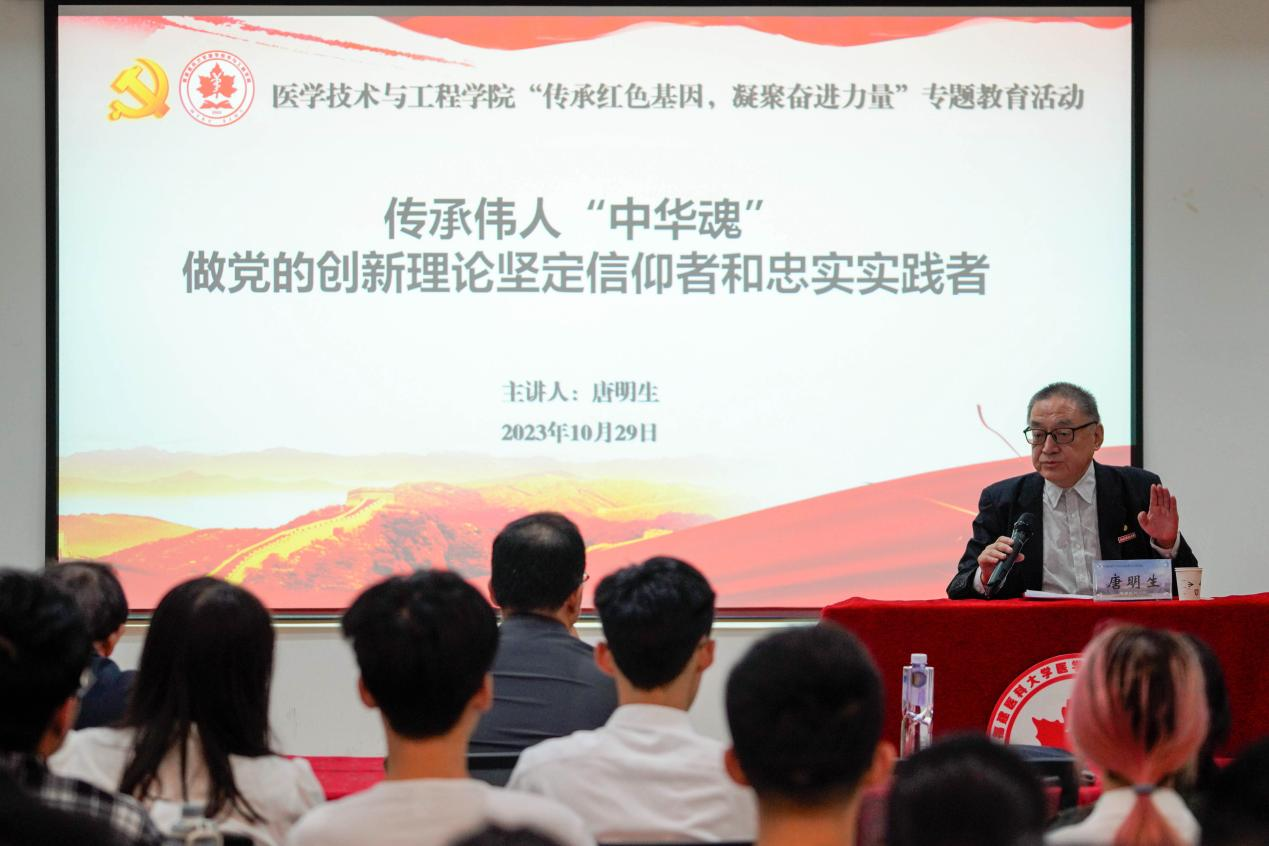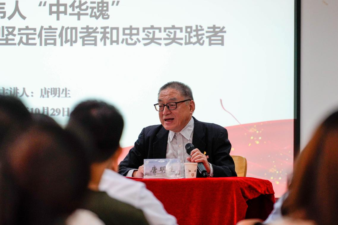 为深入学习贯彻习近平新时代中国特色社会主义思想,推动党史学习教育常态化长效化,缅怀伟人丰功伟绩,赓续精神血脉,传承红色基因,2023年10月29日,以诚为本赢在信誉9001cc党委精心打造的红色思政课在旗山校区创新创业创造中心精彩开讲。校关工委副主任唐明生以“传承伟人‘中华魂’,做党的创新理论坚定信仰者和忠实实践者”为题,为学院师生带来了一次生动的红色文化教育课。学校关工委副主任李元芳,学院党委书记戴乐源,各年级辅导员,学院全体团学干部,入党积极分子等共计100余人参加活动。活动由学院党委副书记薛来兴主持。