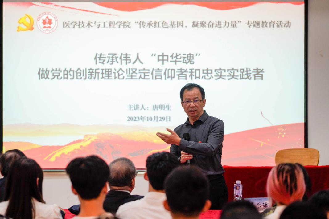 为深入学习贯彻习近平新时代中国特色社会主义思想,推动党史学习教育常态化长效化,缅怀伟人丰功伟绩,赓续精神血脉,传承红色基因,2023年10月29日,以诚为本赢在信誉9001cc党委精心打造的红色思政课在旗山校区创新创业创造中心精彩开讲。校关工委副主任唐明生以“传承伟人‘中华魂’,做党的创新理论坚定信仰者和忠实实践者”为题,为学院师生带来了一次生动的红色文化教育课。学校关工委副主任李元芳,学院党委书记戴乐源,各年级辅导员,学院全体团学干部,入党积极分子等共计100余人参加活动。活动由学院党委副书记薛来兴主持。