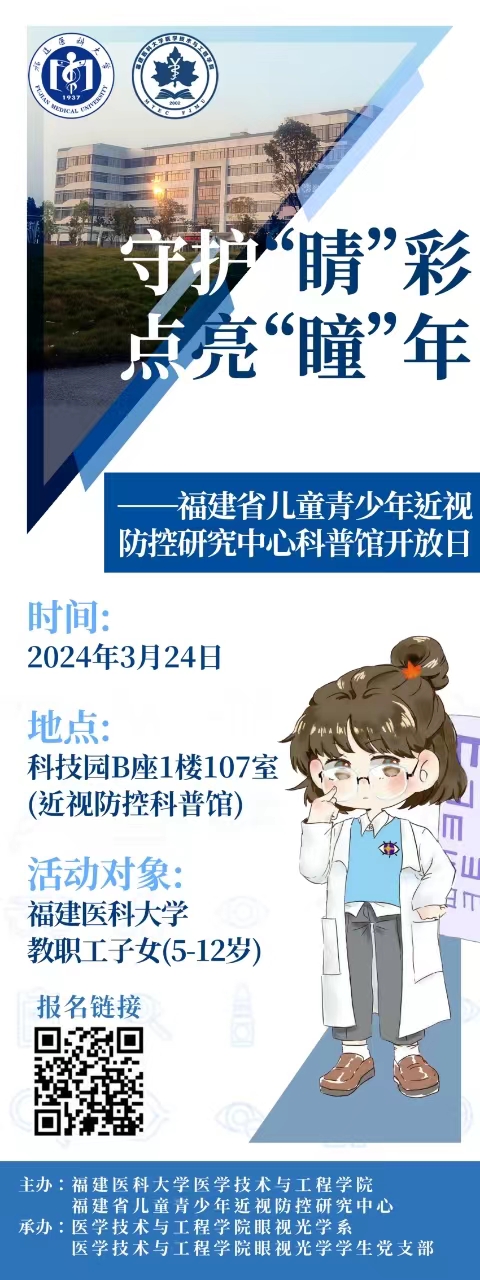 为发挥福建省儿童青少年近视防控研究中心科普馆专业平台优势,帮助我校师生医护员工及儿童青少年深入了解近视防控知识、掌握正确用眼方法、养成良好的视觉健康习惯,决定开展“科普馆开放日”活动。现将有关事项通知如下: