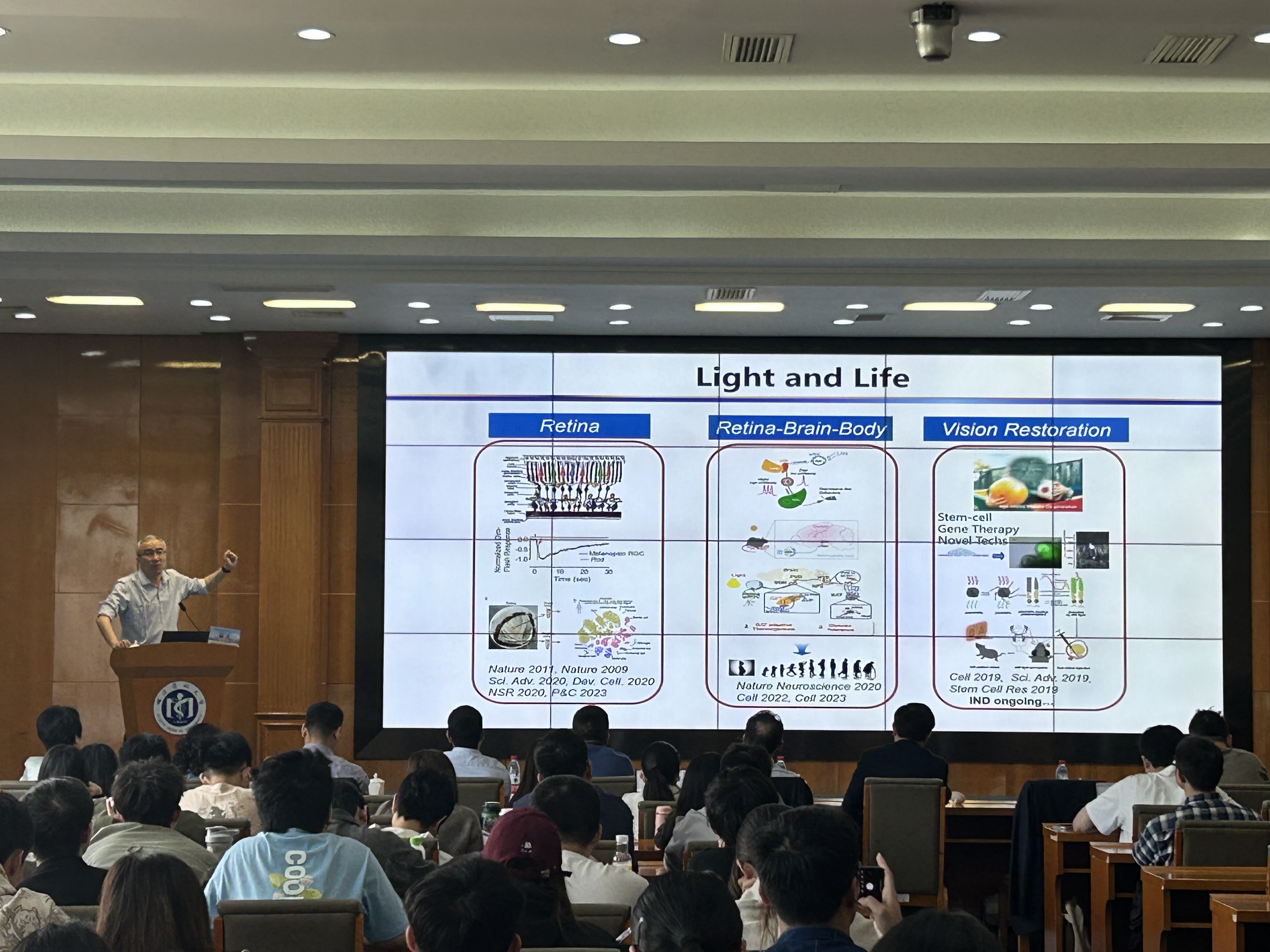 讲座中,薛天教授围绕视网膜和感光细胞的功能、光感受脑神经环路、视觉再生修复等方面,详细展示了其研究团队在“视网膜、眼脑环路、视觉修复”所做的研究工作,有助于推动视觉神经和眼科领域的临床转化。