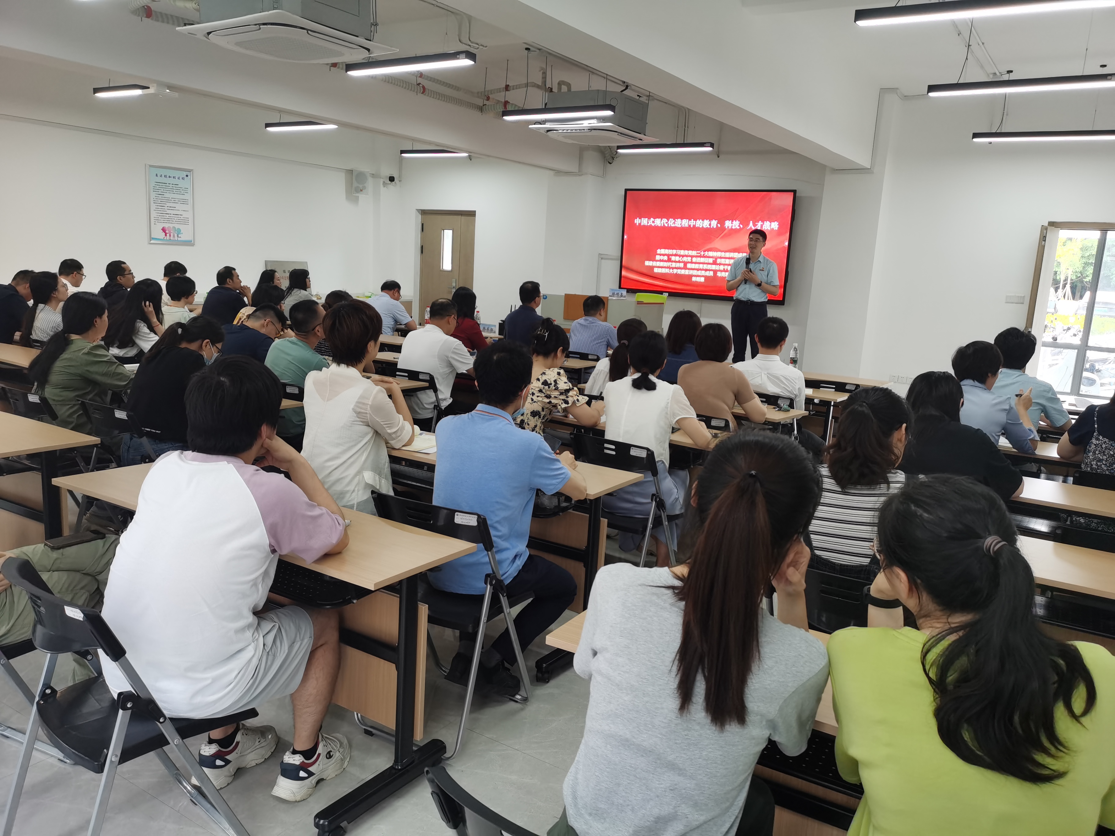 林明惠老师以《中国式现代化进程中的教育、科技、人才战略》为题,紧扣习近平总书记在党的二十大报告中有关教育、科技、人才工作方面的重要论述,从为什么要坚持教育、科技、人才一体推进,怎样加快建设教育强国、科技强国,如何深入实施新时代人才强国战略等多个方面进行了深入浅出的阐述和解读。