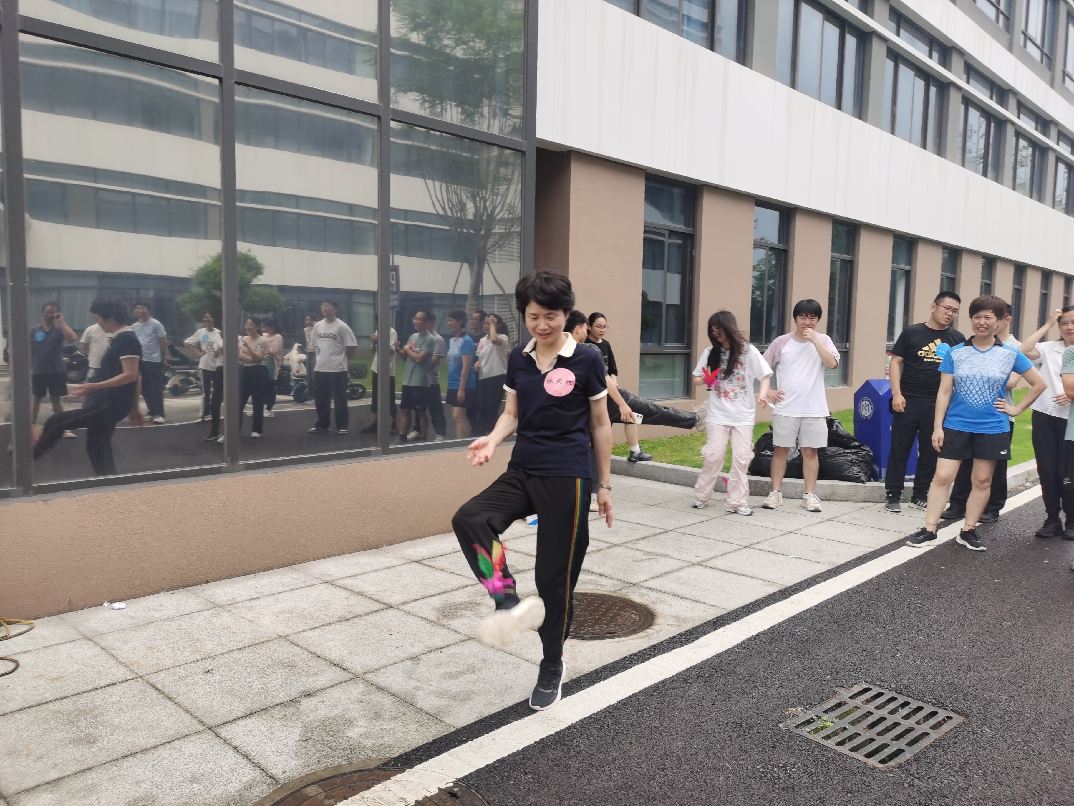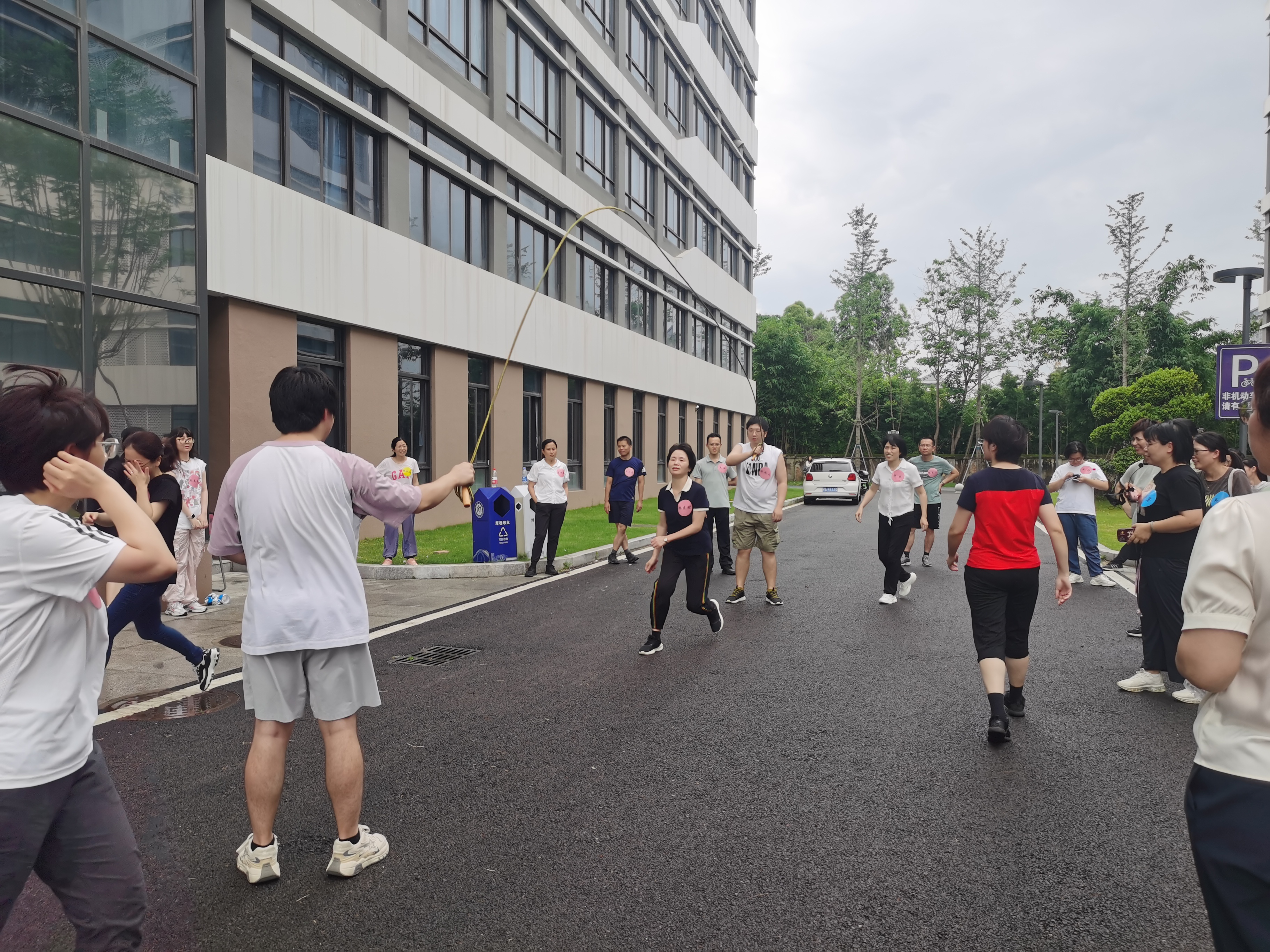 活动设置了环花坛跑、跳绳、垫气排球、踢毽子、仰卧起坐、平板支撑、集体跳8字绳、传动作猜成语及党纪学习教育知识竞答等9项集娱乐性、互动性、协作性、竞争性于一体团体竞赛项目。比赛现场每位教职工都热情高涨,气氛热烈,妙趣横生。大家尽情享受着比赛带来的快乐,笑声、欢呼声、加油声此起彼伏,展现了职工们凝心聚力、踔厉奋发的精气神。