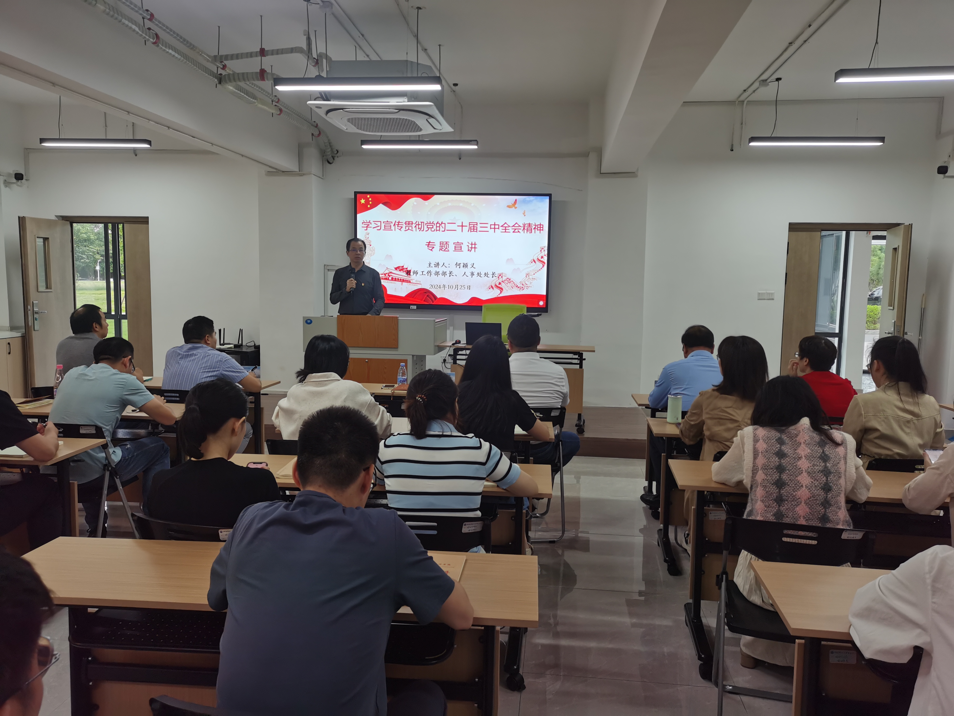 为深入学习宣传贯彻党的二十届三中全会精神,引领广大党员干部深学笃行,迅速把思想和行动统一到党的二十届三中全会精神上来,学院党委于10月25日下午邀请校党委讲师团成员、教师工作部部长、人事处处长何颖义来院做专题宣讲,报告会由学院党委书记戴乐源主持,学院领导及教职员工近50人参加。