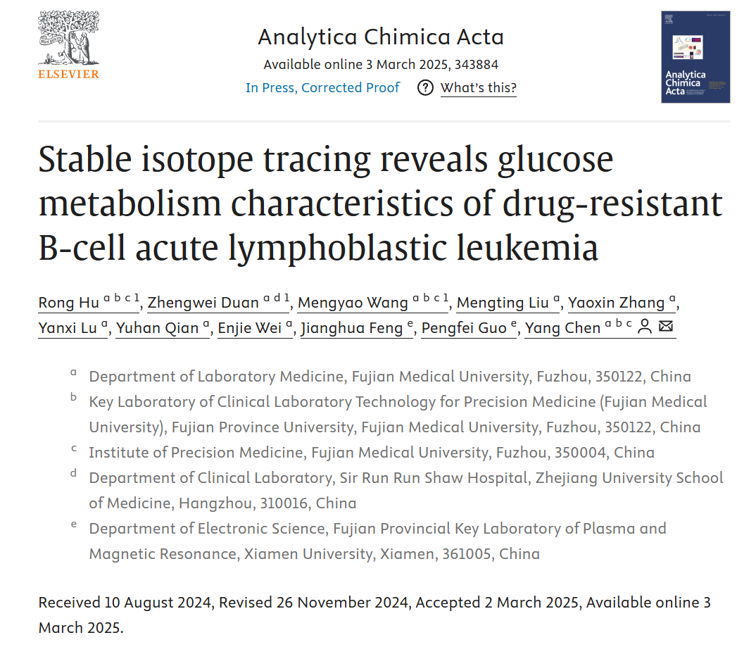 近日,我院医学检验硕士研究生胡蓉、段正伟、王梦瑶,联手本科生刘梦婷、张耀锌、陆彦希、钱宇晗、韦恩婕等同学在中科院JCR一区Top期刊Analytica Chimica Acta 发表题为“Stable isotope tracing reveals glucose metabolism characteristics of drug-resistant B-cell acute lymphoblastic leukemia”的研究论文。