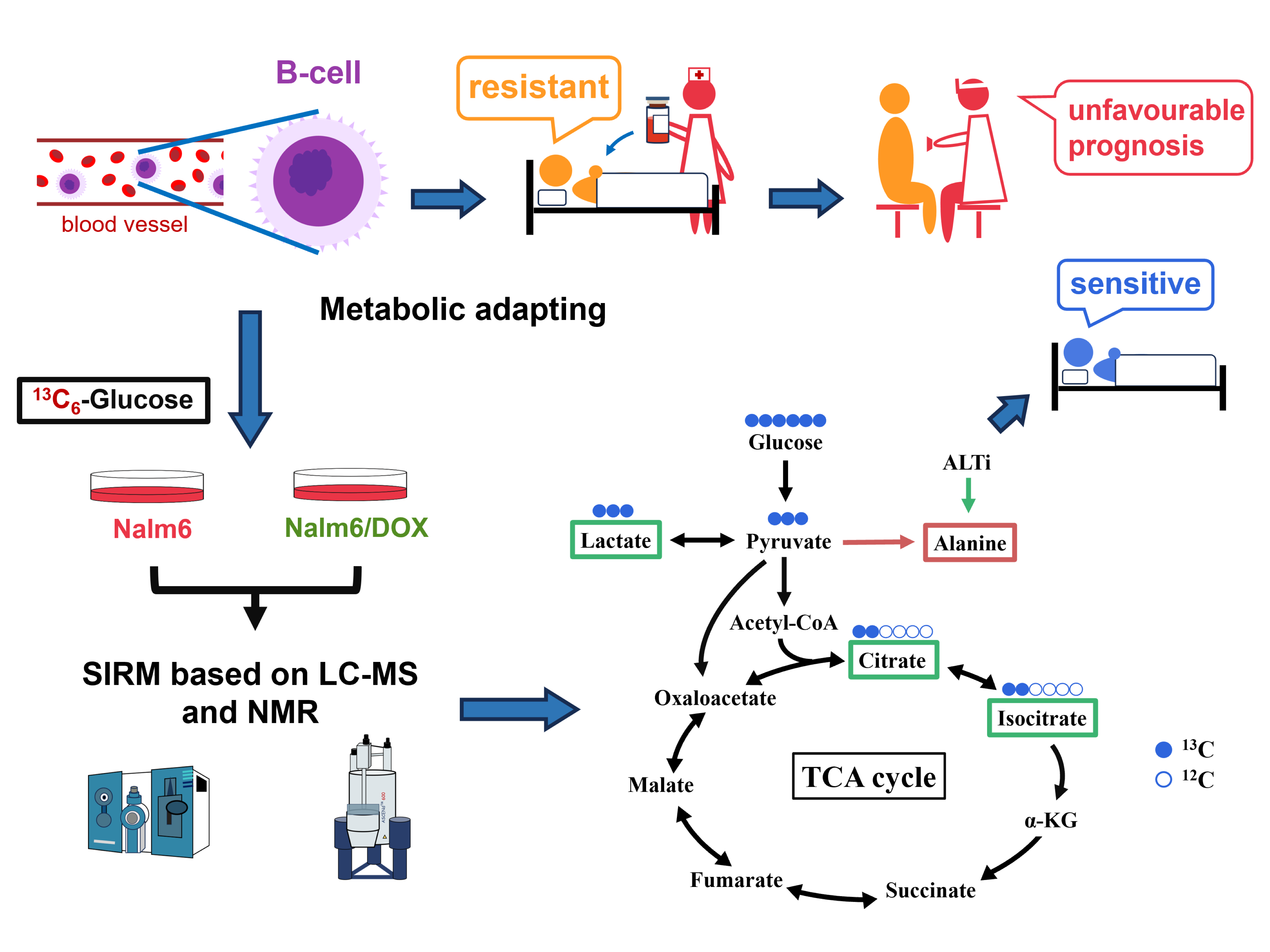 该研究详细阐述了基于稳定同位素解析代谢组学技术的应用方法,揭示耐阿霉素急性淋系白血病细胞的糖代谢特征。通过结合核磁共振技术NMR和超高效液相色谱-质谱串联技术UPLC-MS/MS,发现耐阿霉素的急淋细胞Nalm6表现出糖酵解和三羧酸循环活性降低,而丙氨酸和谷氨酰胺代谢途径的通量增加。同时,利用丙氨酸抑制剂可部分恢复耐药细胞的敏感性,从而提供研究化疗耐药细胞代谢脆弱性的新型策略,为开发潜在代谢靶向干预方法和减少复发提供实验依据。