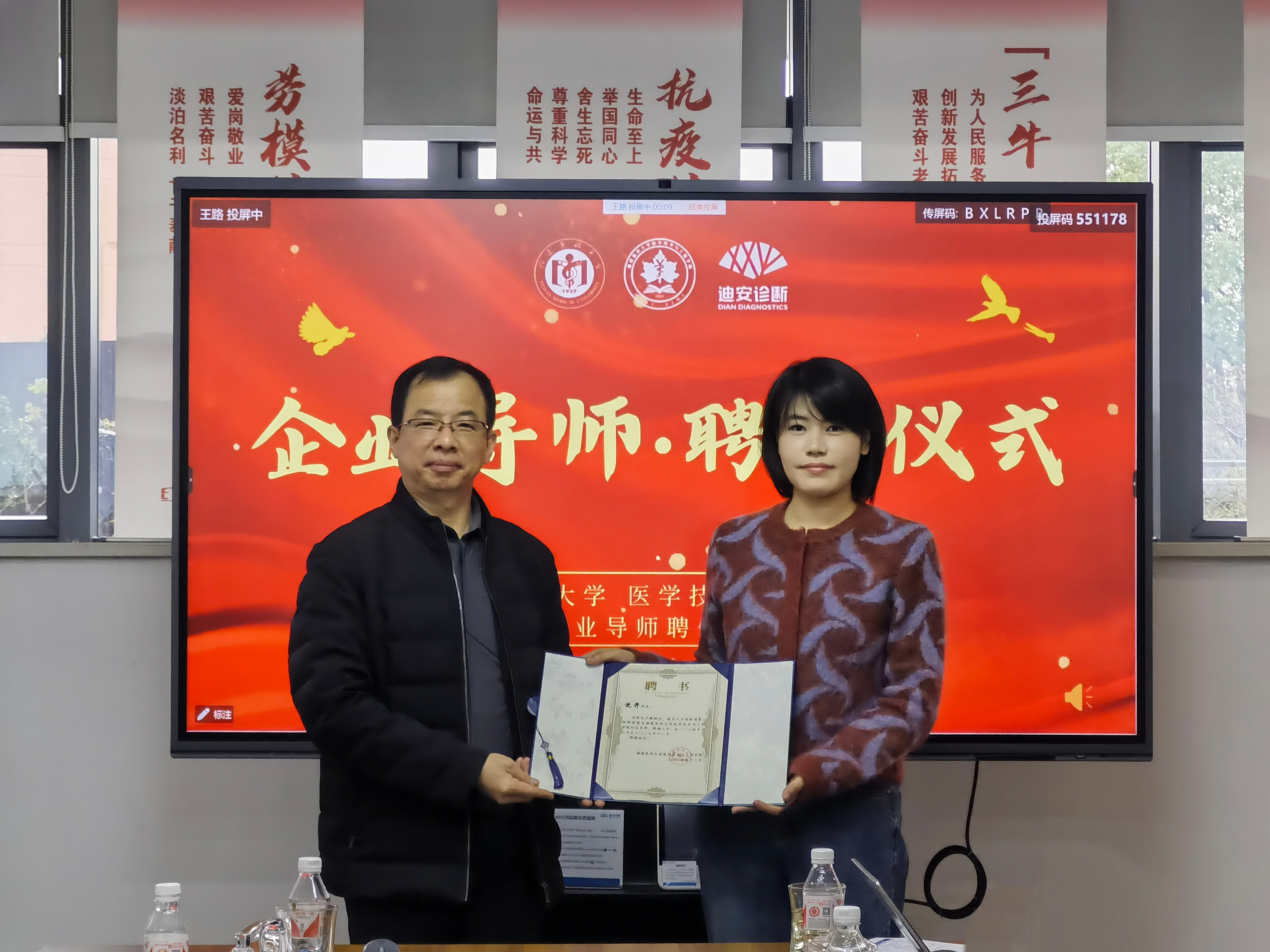 座谈会结束后,戴乐源书记为迪安诊断集团产品中心研发管理部总监沈丹举行了“以诚为本赢在信誉9001cc行业导师”聘任仪式,标志着双方合作进入实质性阶段。