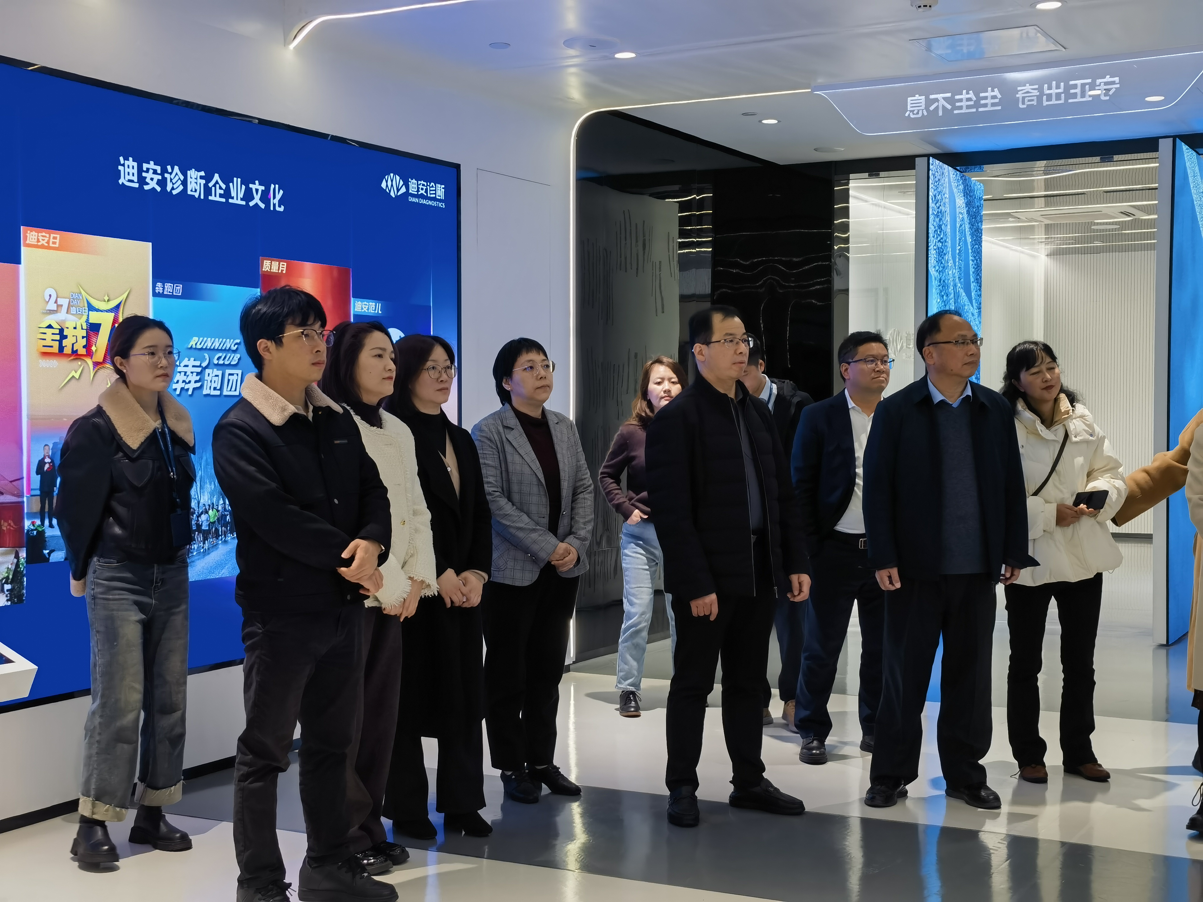 迪安诊断集团杭州总部相关负责人带领大家参观了集团园区、展厅和实验室。技术人员详细介绍了各类高端检测仪器的功能与应用场景,分享了在基因检测、肿瘤诊断、感染性疾病诊断等领域的最新技术成果,让考察团感受到了行业领先的检验技术水平和创新活力。